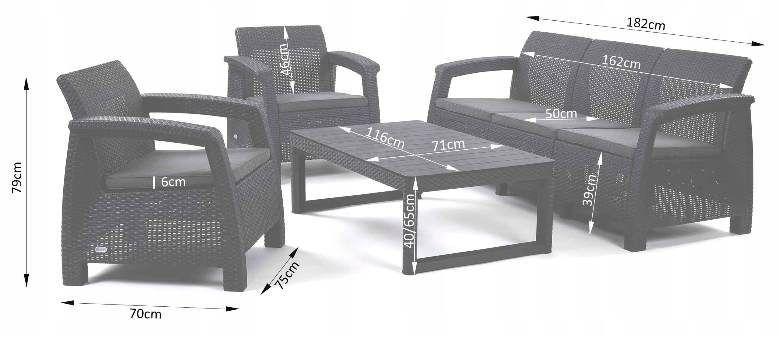 Corfu 3-Set Lyon - це зручний, функціональний набір садових меблів, який включає в себе тримісний диван, 2 крісла і стіл для лавки з можливістю сервіровки в 2-х положеннях: низьке (кава) і високе (вечеря). Ціле виготовлено з міцного пластику - поліпропілену. Сидіння оснащені зручними подушками на блискавці. Комплект призначений для самостійної збірки. Набір ідеально підходить для облаштування садів, терас і дизайну інтер'єру.